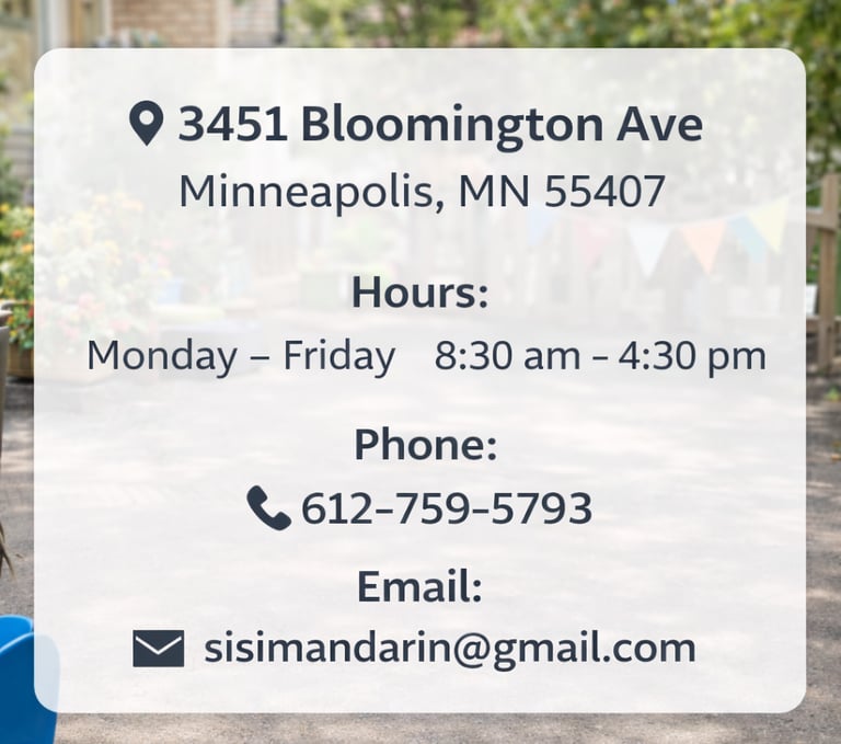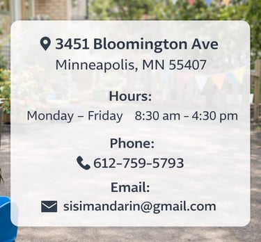 Sisi Chinese Preschool is licensed by the Minnesota Department of Human Services and provides a warm, play-based Mandarin immersion program for children 33 months–11 years. In small classes led by experienced, CPR-certified teachers, each child receives individualized, research-backed care that builds bilingual fluency, social confidence, and kindergarten readiness. Our project-based curriculum—full of songs, stories, and hands-on activities—strengthens attention, memory, and problem-solving while making every day joyful and meaningful.