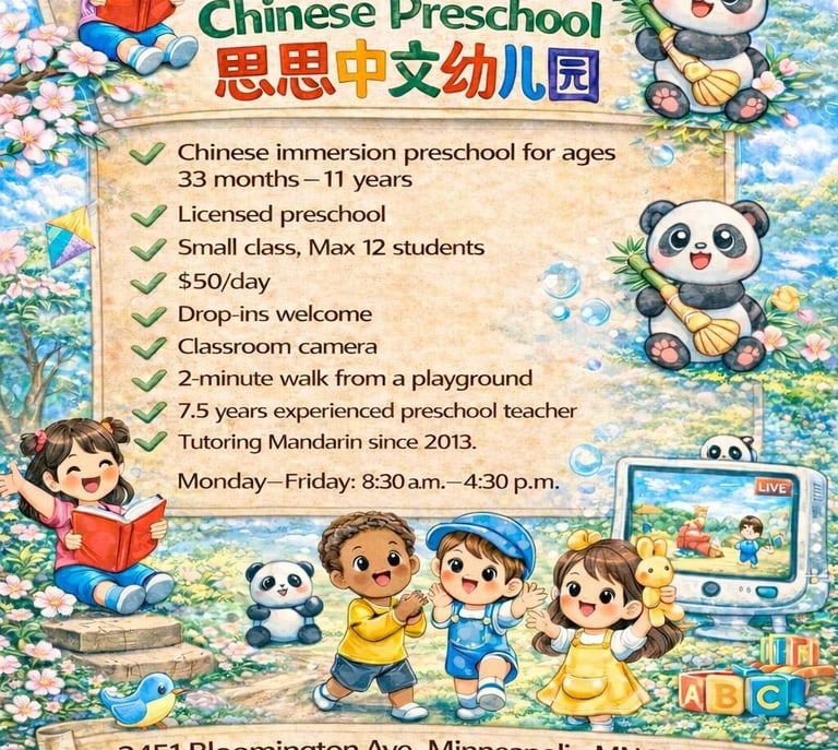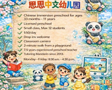 Our programs are designed to prepare children for kindergarten and beyond by building strong social skills, independence, and early academic readiness in Mandarin and English.